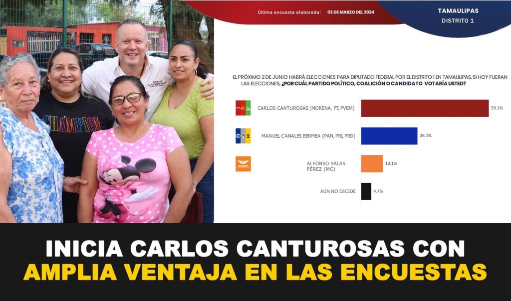 La campaña a la Diputación Federal en Nuevo Laredo inició con una amplia ventaja en las encuestas de Carlos Canturosas Villarreal, candidato de Morena, PT y Verde Ecologista.