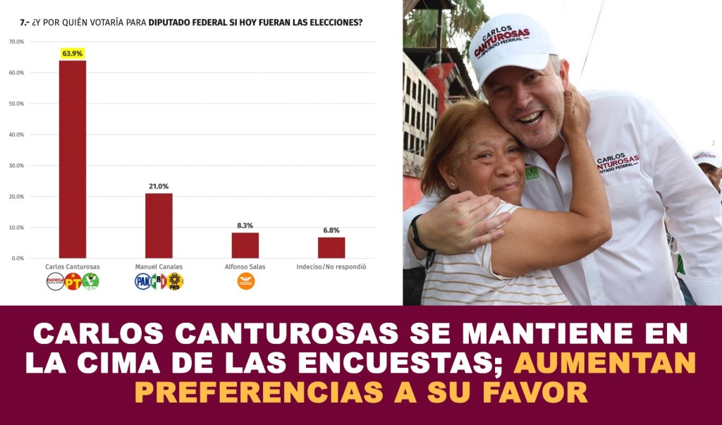 El primer mes de campañas federales terminó y el candidato a la Diputación Federal de la coalición MORENA, PT y Verde Ecologista, Carlos Canturosas Villarreal mantiene su posición de líder en las preferencias electorales, de acuerdo con la última encuesta publicada por el medio de comunicación Hora Cero.