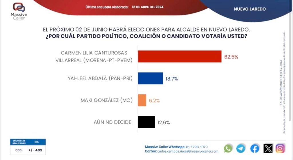 De acuerdo con encuestas publicadas por las empresas Massive Caller y Electoralia, si hoy fueran las elecciones, entre el 60 y 62% de los neolaredenses elegirían a Carmen Lilia Canturosas como su presidenta municipal.