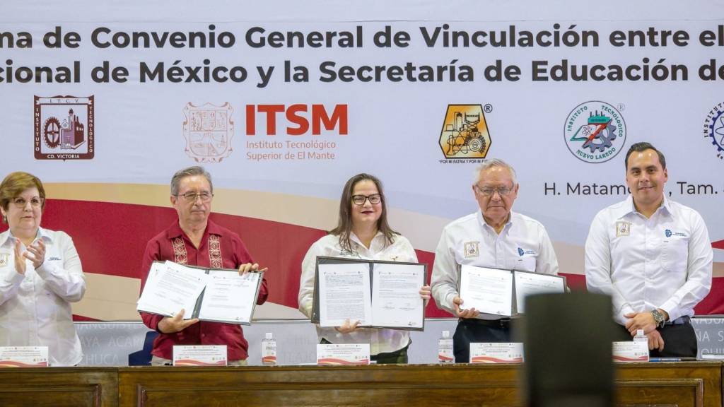 La firma de este compromiso se realizó en las instalaciones del Tecnológico de Matamoros, donde la secretaria de Educación en el estado, Lucía Aimé Castillo Pastor, y el director general del Tecnológico Nacional de México (TecNM), Ramón Jiménez López, signaron este convenio, acompañados por decenas de estudiantes del plantel, así como autoridades educativas federales, estatales y municipales.