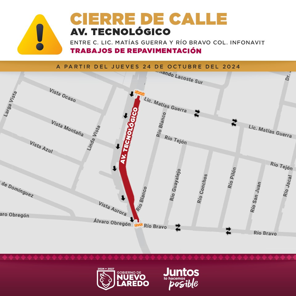 Debido a trabajos de repavimentación, a partir de este jueves 24 de octubre se cerrará a la circulación la avenida Tecnológico, entre Matías Romero y Río Bravo en la colonia Infonavit.