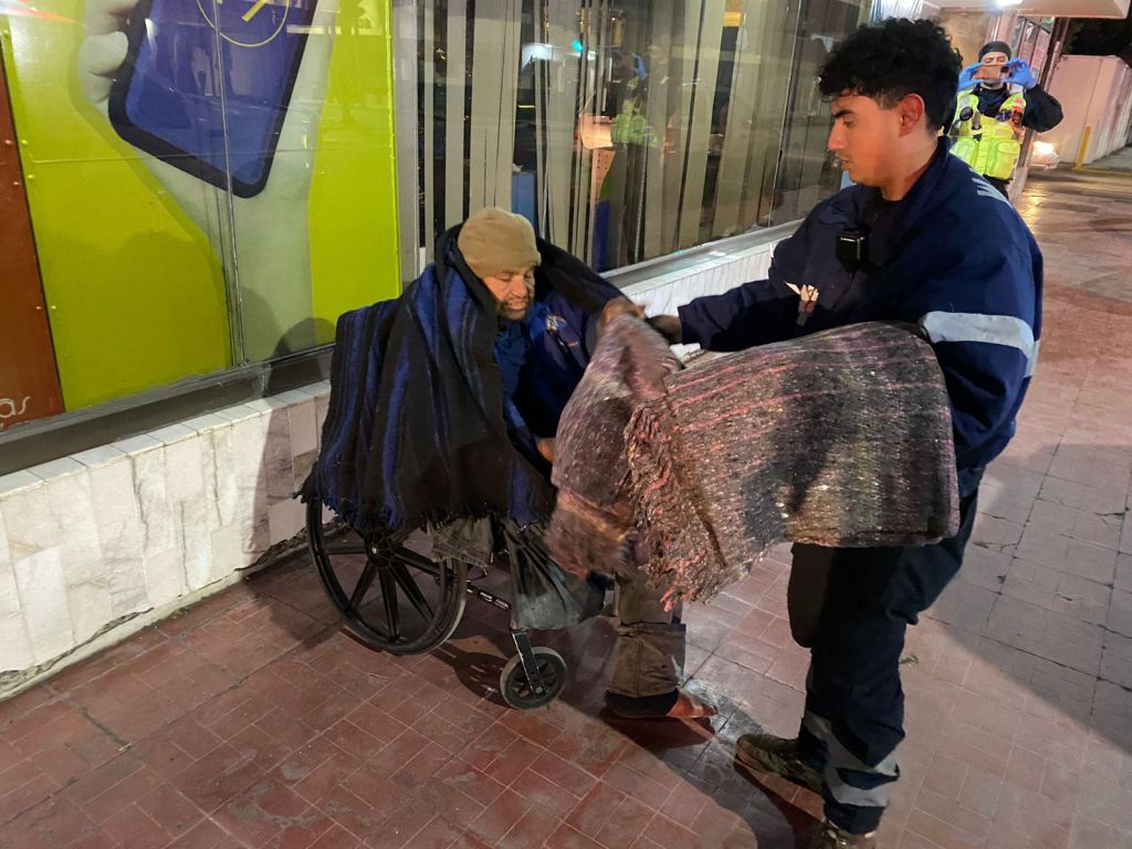 Elementos de la Dirección de Protección Civil y Bomberos recorrieron diferentes puntos de la ciudad para llevar abrigo, bebida caliente y pan a personas en situación de calle, ante el descenso de la temperatura.