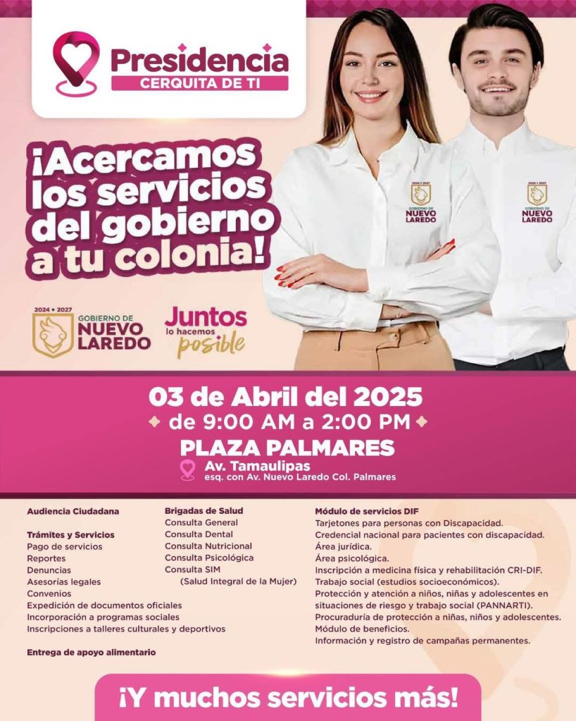 Todo está listo para que este jueves 3 abril, vecinos de la colonia Palmares, accedan a todos los beneficios, trámites y servicios del Gobierno Municipal a través del programa Presidencia Cerquita de Ti, que se instalará en la plaza ubicada en Ave. Tamaulipas esquina con Nuevo Laredo, de esta colonia.