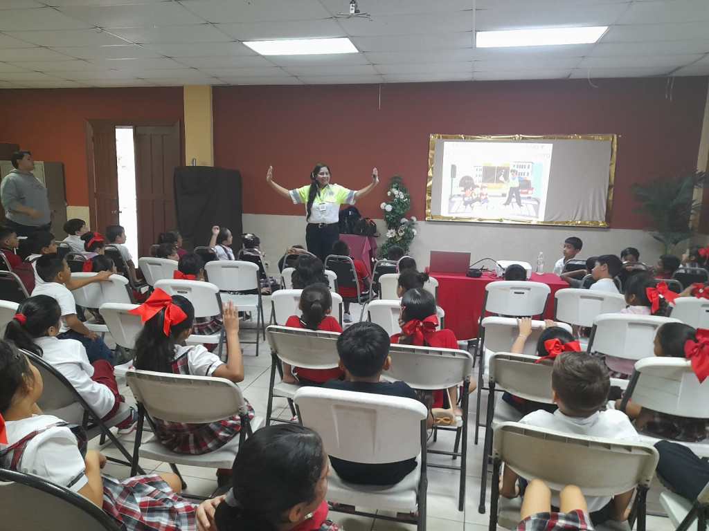 Asimismo, se exhortó a los estudiantes a no viajar en los estribos del camión y a subir o bajar únicamente cuando el vehículo esté completamente detenido. También se abordaron reglas básicas de peatón y conductor, incluyendo el respeto a las señales de tránsito como el alto, el semáforo y las indicaciones de los agentes viales.