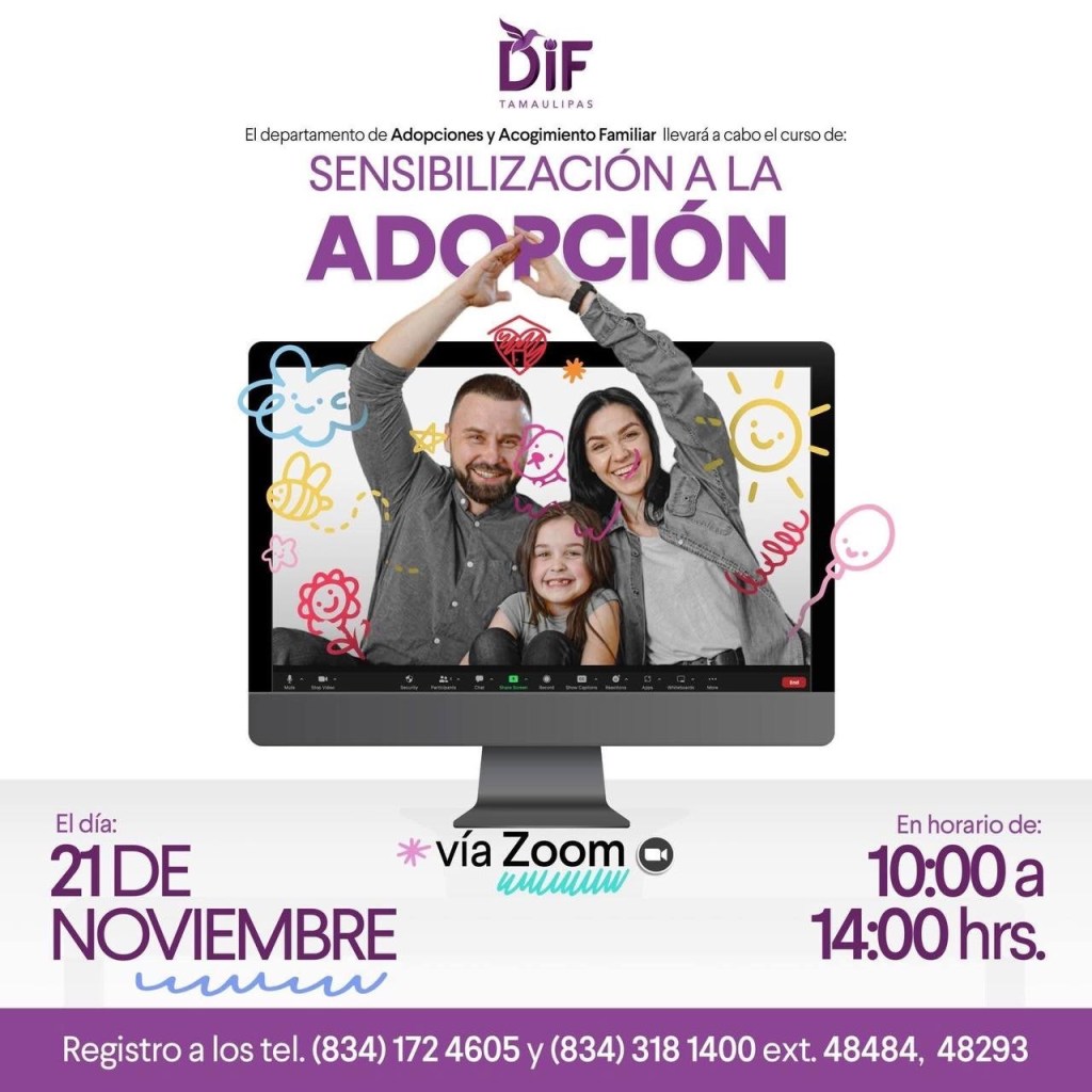 El Sistema DIF Nuevo Laredo invita a las y los ciudadanos interesados en participar en el Curso de Sensibilización a la Adopción, que será impartido por el DIF Tamaulipas el próximo 21 de noviembre, en un horario de 10:00 a 14:00 horas, a través de la plataforma Zoom.