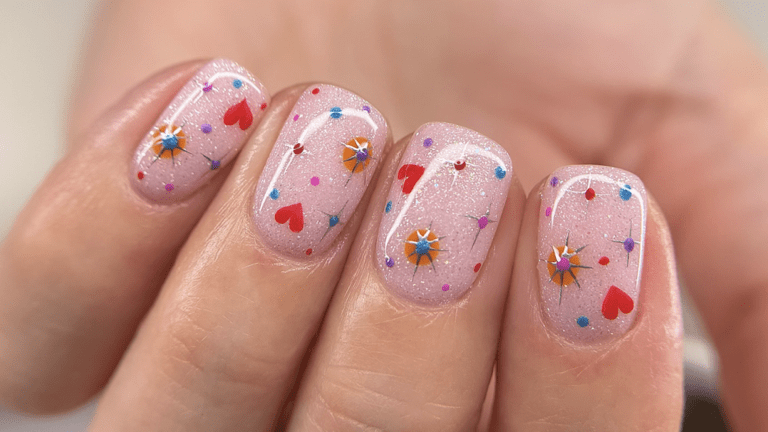 Las uñas con base transparente y dibujos finos como corazones, flores pequeñas o trazos abstractos son ideales si buscas algo artístico.